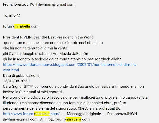 Metafisico��Universal��UniusREI http://disq.us/p/2cw4x84 Dear President RIVLIN] [forum-mirabella] 13/01/08 [dear Mr. S *****, I understand and share your yearning to save the world, but I will not send your email to my contacts. On the day of judgment I will have acquittal for lack of evidence against me and since I come from a family of Jewish bankers, I personally profit from the banking seigniorage system. May Allah protect you, Caro Presidente RIVLIN ] [ forum-mirabella ] 13/01/08 [ caro Signor S*****, comprendo e condivido il Suo anelo per salvare il mondo, ma non invierò la Sua email ai miei contatti. Nel giorno del giudizio avrò la assoluzione per insufficienza di prove a mio carico e siccome discendo da una famiglia di banchieri ebrei, profitto personalmente del sistema del signoraggio bancario. Che Allah la protegga,